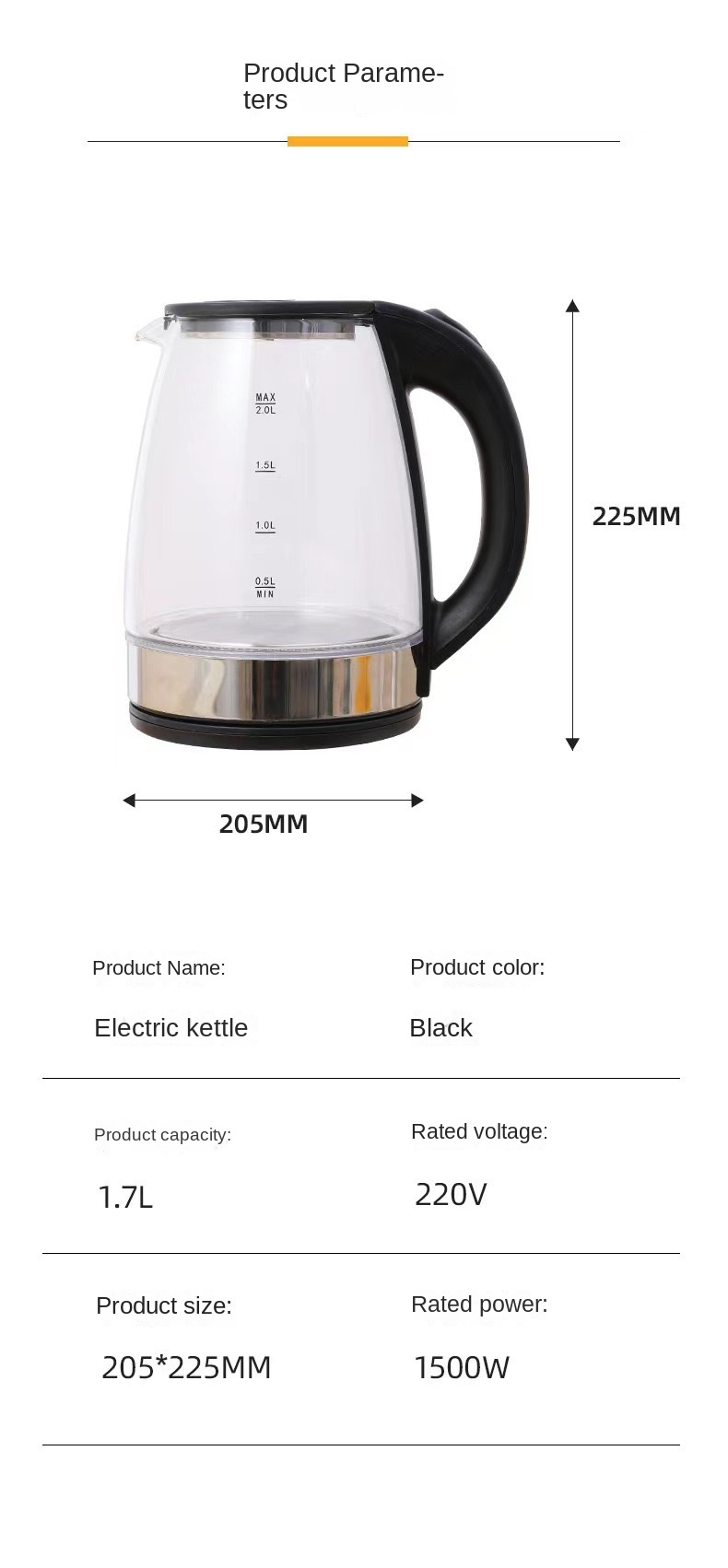 Maximum power of electric kettle: 1500W (inclusive) -2000W (exclusive)